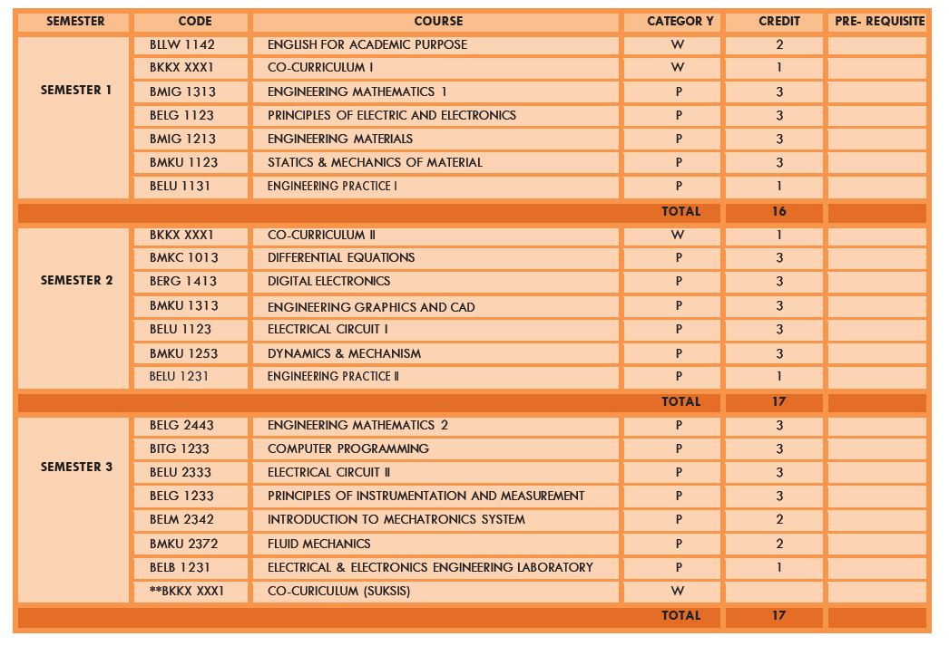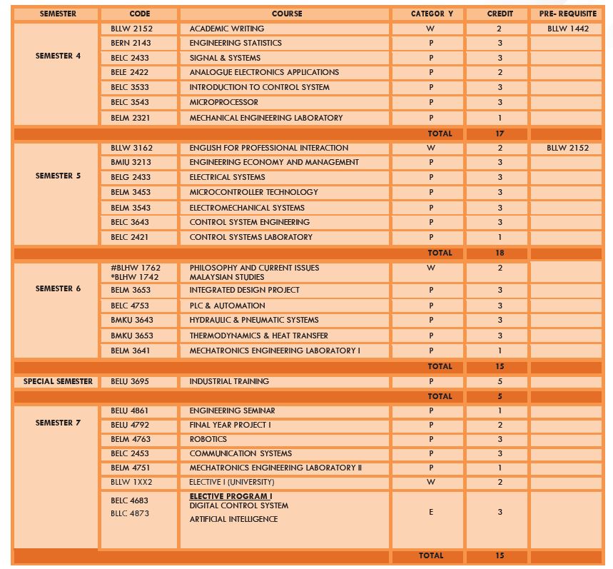 The programme will emphasis on Mechatronics Engineering with the composition of the credits are as follows: